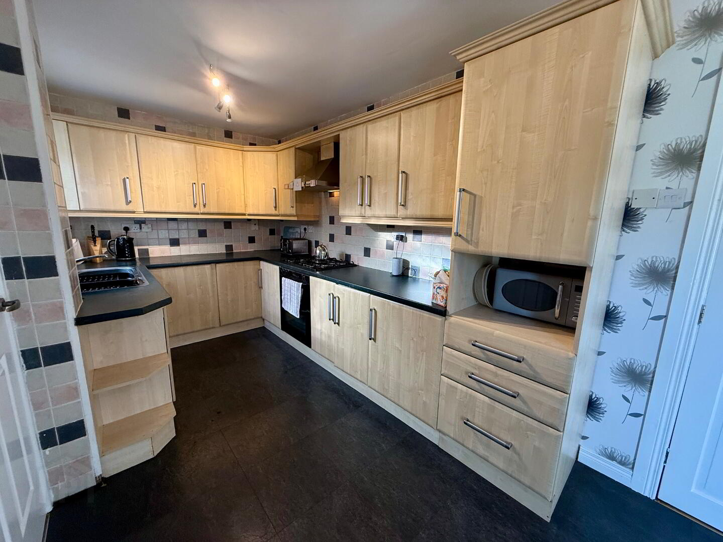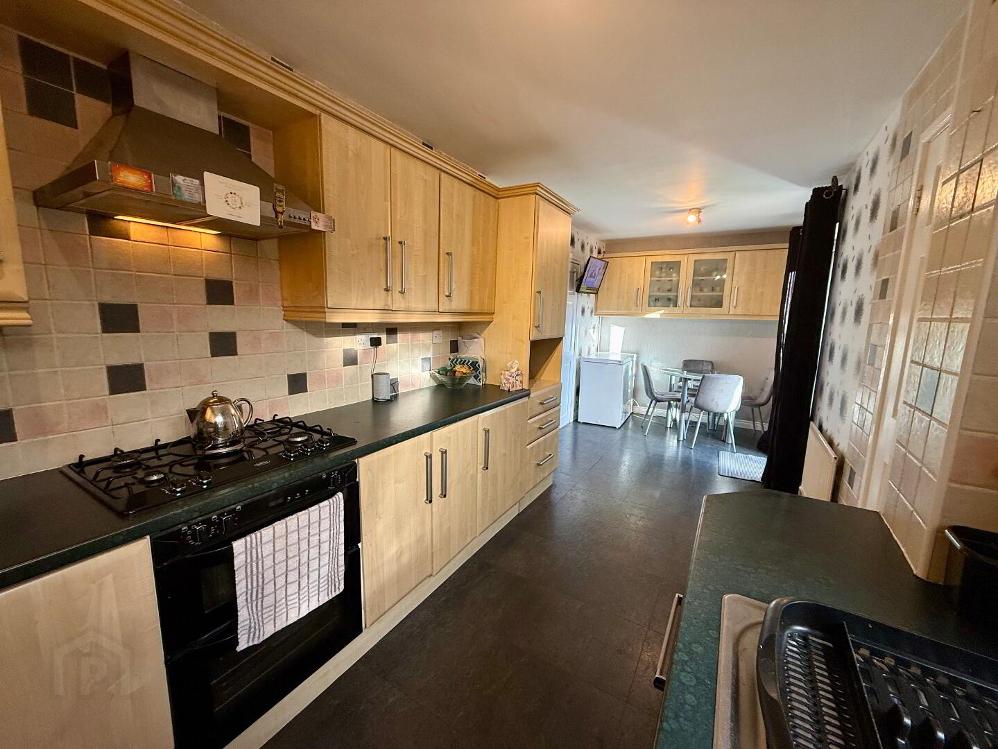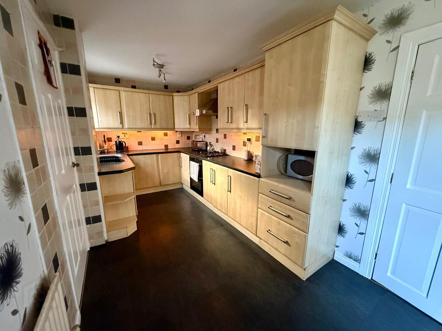 21’5’’X7’ Fully fitted shaker style kitchen with open ended display, Frosted Glass display units, Formica work surfaces, 5 ring gas hob, Double Fan assisted oven with grill, Stainless steel extractor fan with lights, Integrated dishwasher, integrated fridge, housing unit for microwave, Under unit ambient lighting, Stainless steel sink unit with mixer tap, Part tiled walls, radiator, power points, French double doors into rear garden, access to utility area & outside storage utility area.