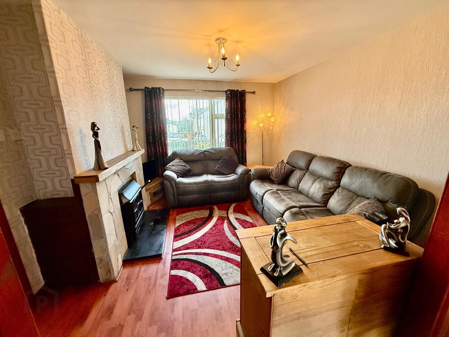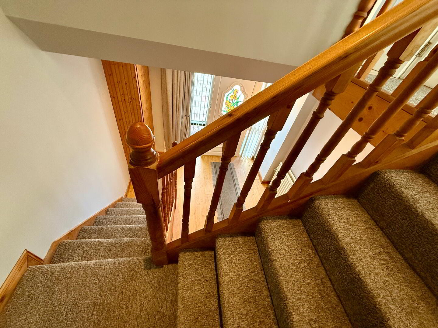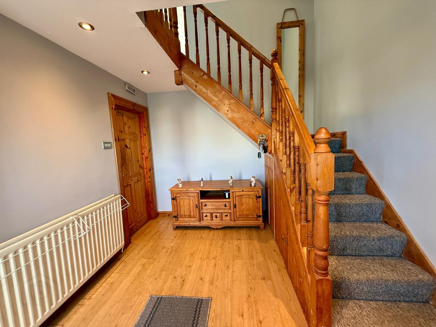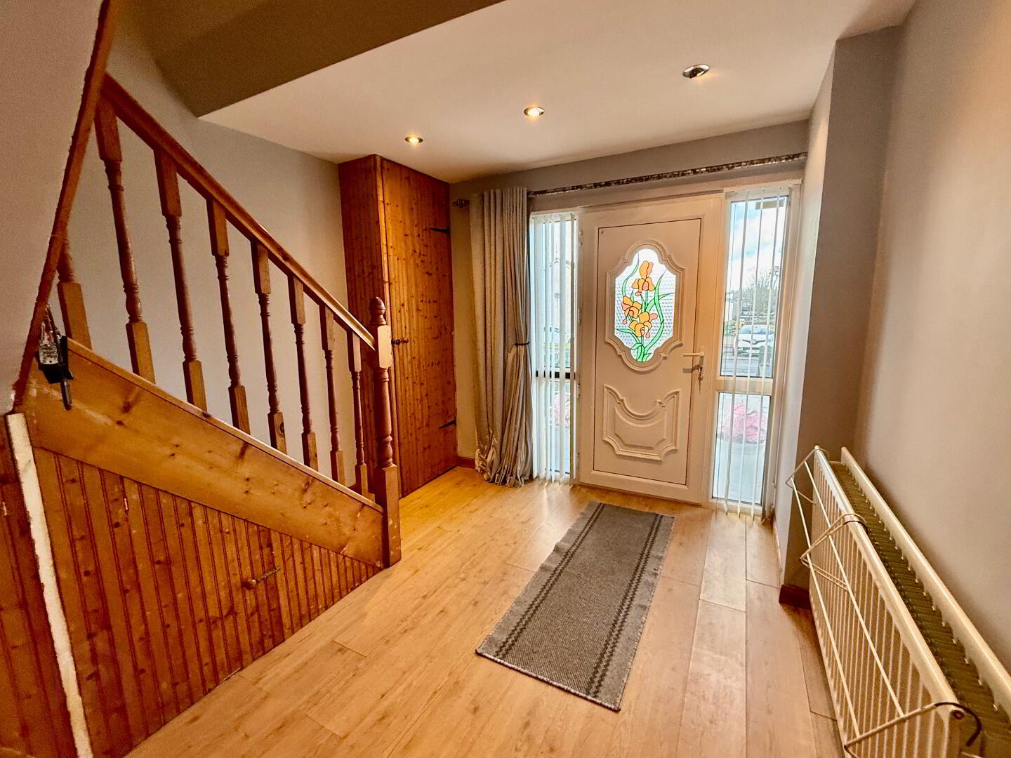 Very welcoming reception hall with low maintenance pine split level staircase, Laminated wooden floor, Radiator, storage under stairs, Spotlights, power points.