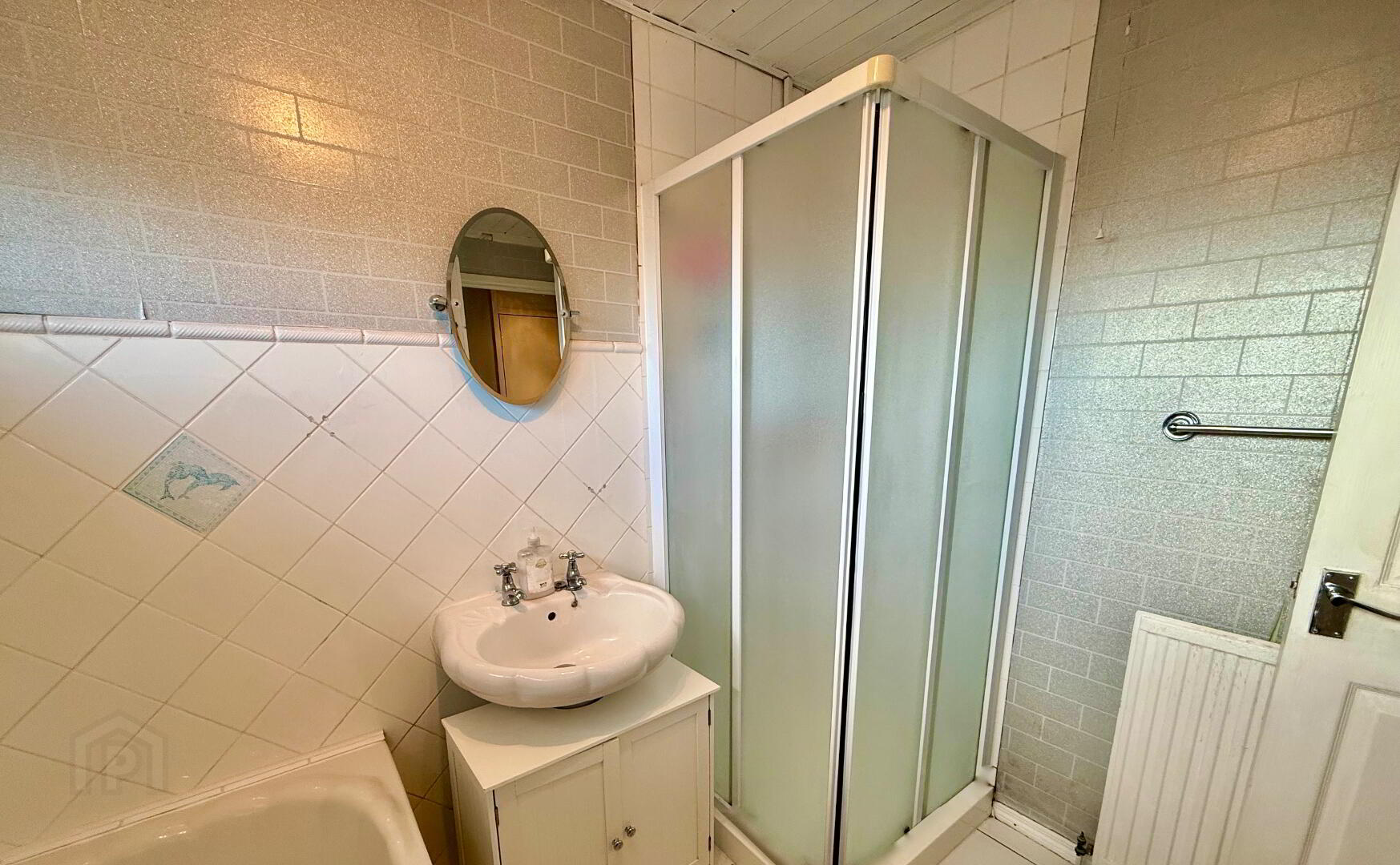 7’4’’X6’8’’ White sanitary ware, Pedestal wash hand basin with pillar taps, Bath with chrome mixer taps and handheld shower hose, fully enclosed shower cubicle with electric shower, Tiled floor, radiator, extractor fan.