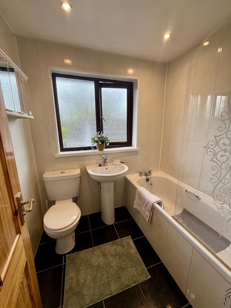 6’4’’X5’7’’ White sanitary ware, low flush Wc, pedestal wash hand basin with monobloc mixer tap, bath with pillar mixer taps, “Redring” shower over bath with toughened glass screen, fully Pvc lined walls, spotlights, Tiled floor.