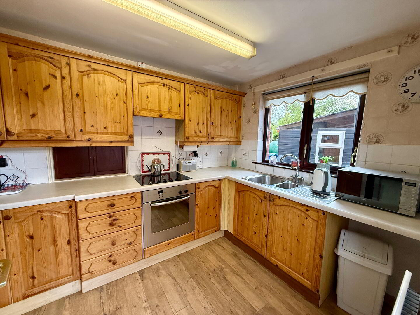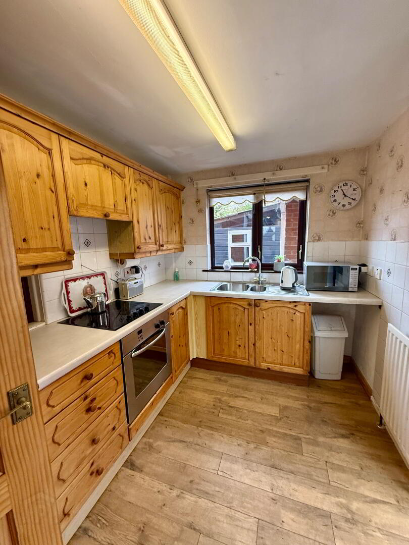 9’7’’X7’4’’ Fully fitted pine kitchen, leaded glass display unit, Formica work surfaces, stainless steel sink unit with vegetable bowl & swan neck mixer tap, “Bosch” fan assisted oven, 4 ring ceramic hob, concealed cooker hood with extractor fan & light, Part tiled walls, radiator, power points, access to rear garden & garage.